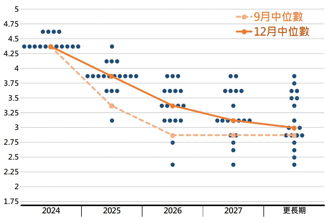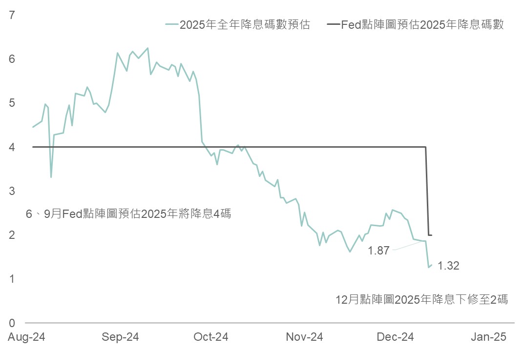 ▲ 市場利率期貨與Fed點陣圖對明年降息碼數