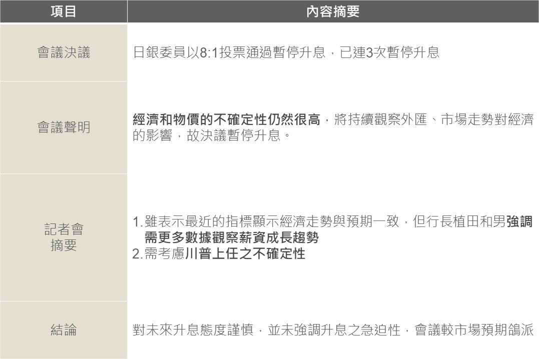日銀12月貨幣政策會議維持政策利率0.25%不變,因前幾週當地媒體已透露日銀內部不贊成升息,故本次決議大致符合市場預期,不過未來利率指引方面展現更鴿派立場,隨近期日圓走貶市場原預期日銀將釋出明年1月升息的訊號以阻止日圓貶勢,然行長受記者訪問時表示需觀察更多薪資成長證據、且需考慮美國新政府上任之不確定性(如關稅),對未來升息看法較為謹慎,料短期日圓將延續疲弱,或為日股提供支撐。
