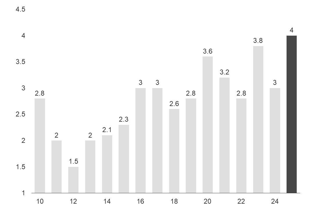 雖市場於Fed利率會議前多已預期12月點陣圖將縮減2025年降息碼數至2碼,然會議後Fed釋出更鷹派訊息,促使市場再度下修對Fed明年降息碼數至僅剩1.3碼,並在SEP經濟預估中將失業率下調、經濟與通膨預估上修下,預期經濟具韌性與通膨擔憂或使美債殖利率下行速度趨緩,本次將2025年Q1美國10年公債殖利率預估由原先3.9%上修至4.3%,但Fed表示不致於轉趨升息,Q2至Q4殖利率維持原預估。