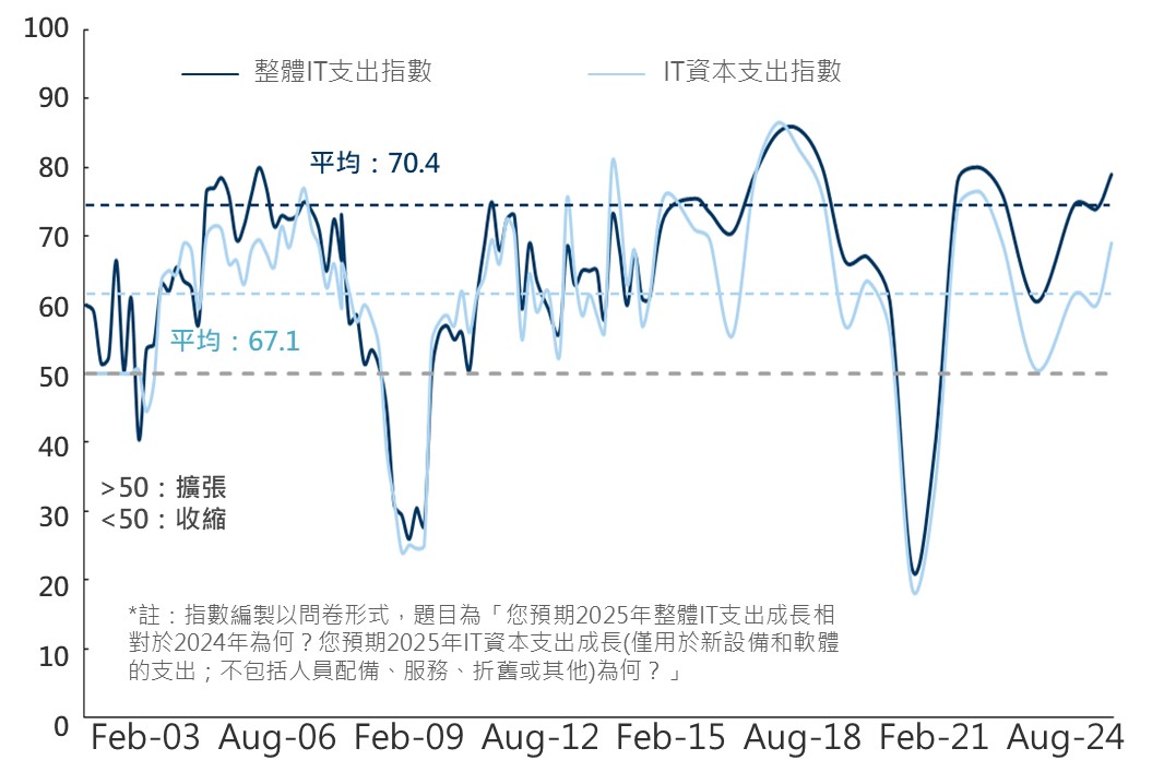 展望2025年企業對於科技及AI投資需求,根據高盛11月調查所編制之IT(資訊科技)支出指數維持上升趨勢,整體IT支出從前次調查的74上升至79,資本支出方面也從60上升至69,並皆高於近十年均值水準,調查還指出明年預計IT支出有所成長的受訪者比例已增加至70%,其中預計將IT支出預算分配至AI相關領域近3年也將成長達2.5倍以上,或進一步帶動其餘IT服務業務,其顯示整體AI科技需求仍樂觀。