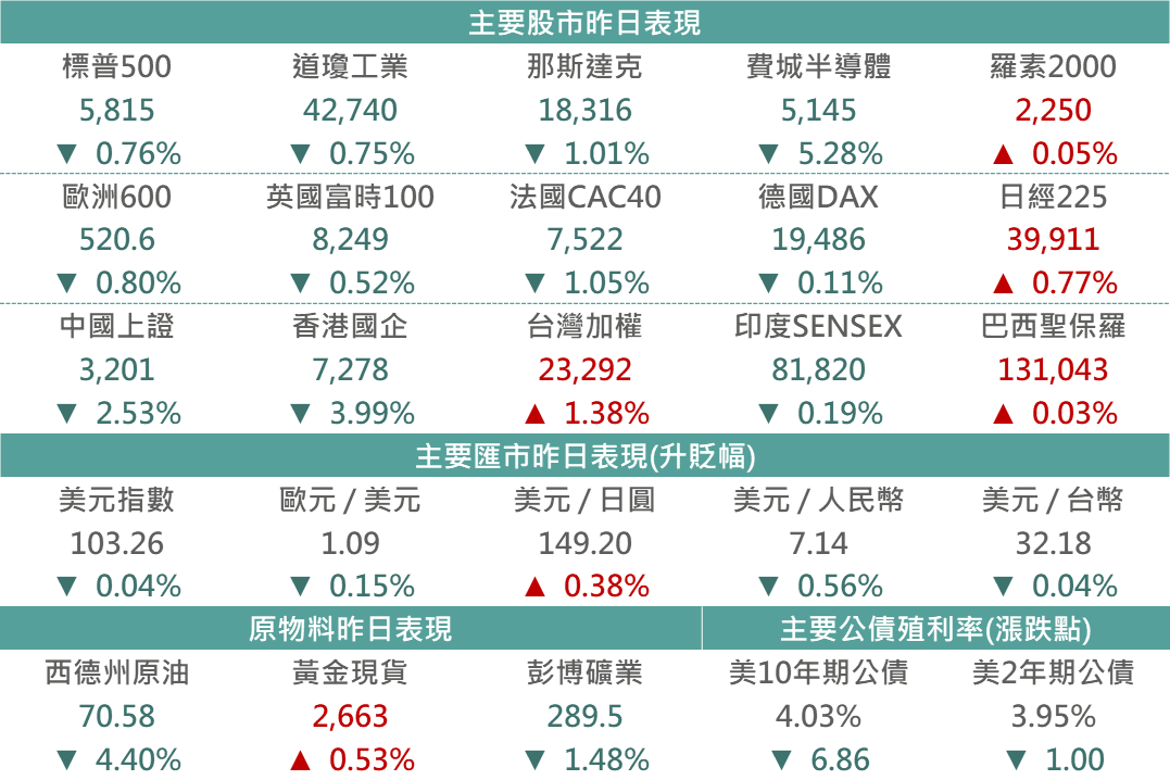 昨日美國公布10月紐約州製造業調查指數自前月的11.5降至-11.9,低於市場預期的3.6,顯示美國製造業仍未見明顯復甦;而昨日舊金山Fed總裁戴莉(Mary Daly)則表示目前Fed實現軟著陸的工作尚未完全完成,其對年內再降息1-2碼持開放態度。整體而言,市場對後續經濟景氣之展望仍存疑慮,在美股進入Q3財報旺季期間,市場亦將高度關注企業財報結果;惟昨日半導體設備商ASML公布Q3財報結果遜於市場預期,市場疑慮加劇促昨日半導體類股領跌,美股主要指數亦受拖累呈現修正,市場於企業財報季期間呈現震盪之格局。