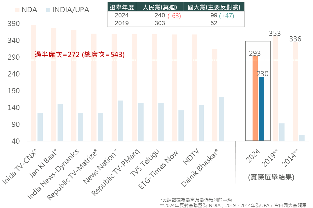 6/2(日)印度結束自4月中旬以來7階段的下議院大選投票期程後,各家機構公布出口民調幾乎顯示現任總理莫迪領導的NDA執政聯盟將輕鬆過半,甚或超過國會三分之二絕對多數(362),令投資人樂觀看待6/4(二)開票結果,並期待執政黨取得優勢席次將進行更大幅度的結構改革,解除長期經濟成長的限制,促使週一印度股市大漲3.4%,再創歷史新高。