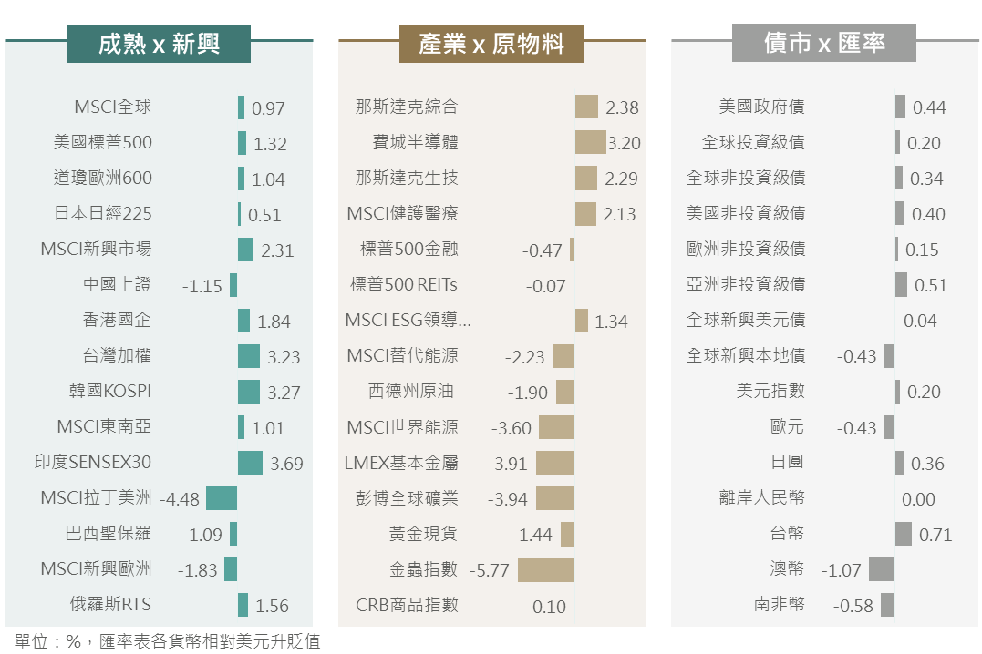 上週ISM製造業指數與部分就業數據顯示美國經濟動能有所放緩,混合週五5月非農就業人數高於預期,市場對Fed降息期待先提升後收斂下,添增部分金融市場起伏;而台北Computex電腦展期間科技龍頭陸續釋出正面消息,且輝達進行股票分割後繼續走揚,致上週科技股仍得以持續引領主要股市指數偏升走勢;相對而言,市場對經濟前景的擔憂則更多地壓抑到原物料整體表現,使油、礦、金等相關商品與類股上週近乎全面收跌。