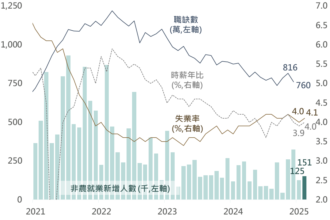 美國2月非農就業新增人數自12.5萬升至15.1萬人,惟失業率自4.0%升至4.1%,觀察非農報告細項,2月因惡劣天氣而無法工作者仍高達40.4萬人,反映年初以來之野火與嚴寒影響尚未完全消退,且因美國政府效率部(DOGE)之政策,人事縮減亦使政府新增就業人數自4.4萬降至1.1萬;整體而言,雖勞動市場數據存在部分放緩跡象,然目前並未見企業出現廣泛或大幅裁員現象,評估整體勞動市場依然穩定。