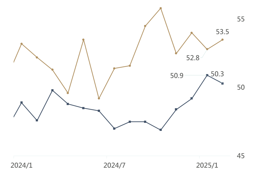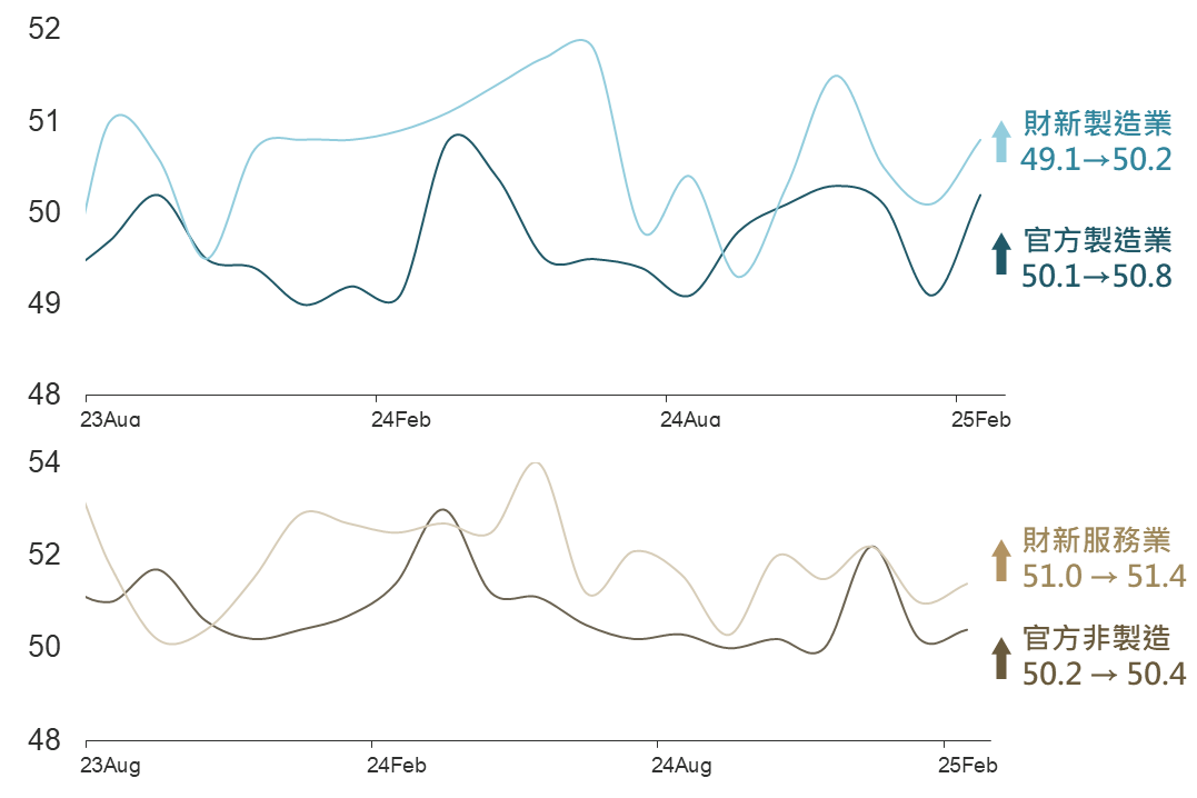 然短期而言,美國關稅政策將對製造業復甦路徑增添干擾;觀察ISM製造業PMI之進口指數自51.1升至52.6,且供應商交貨時間拉長(54.5),顯示企業為避關稅而出現搶進口之現象,加以當前關稅政策反覆,皆為商貿訂單規劃及供應鏈交貨帶來一定程度之混亂,企業調查回報亦不乏有將調漲價格之狀況。綜上,考量川普將於4月進一步提出對等關稅等相關政策,評估短期政策之發展與影響仍具較高不確定性。