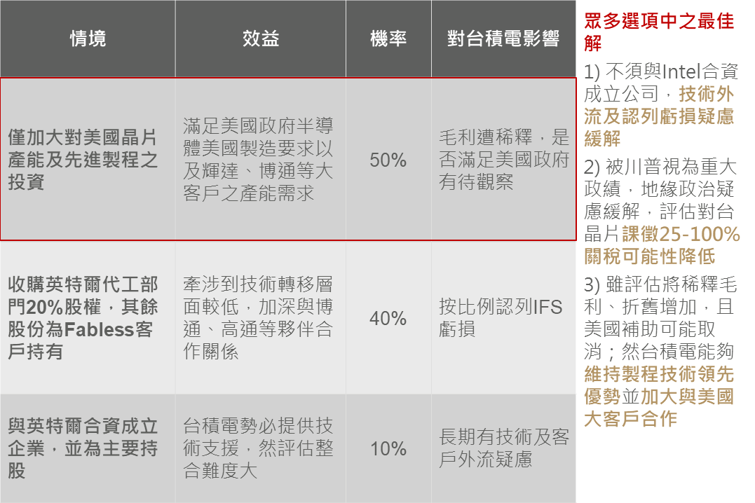 台積電上週宣布將於美國擴大投資1,000億美元,用於興建3座晶圓廠、2座先進封裝廠及1座研發中心,總投資額將達到1,650億美元;評估在川普政府施壓之下,已經為台積電眾多不利選項之中,相對可接受之結果,原因包含: (1)不須收購或合資Intel代工廠,技術外流及認列虧損疑慮緩解;(2)成為川普上任後重大政績,降低其對於課徵台積電晶片關稅之可能性;(3)維持製程優勢並擴大與美國晶片客戶合作。