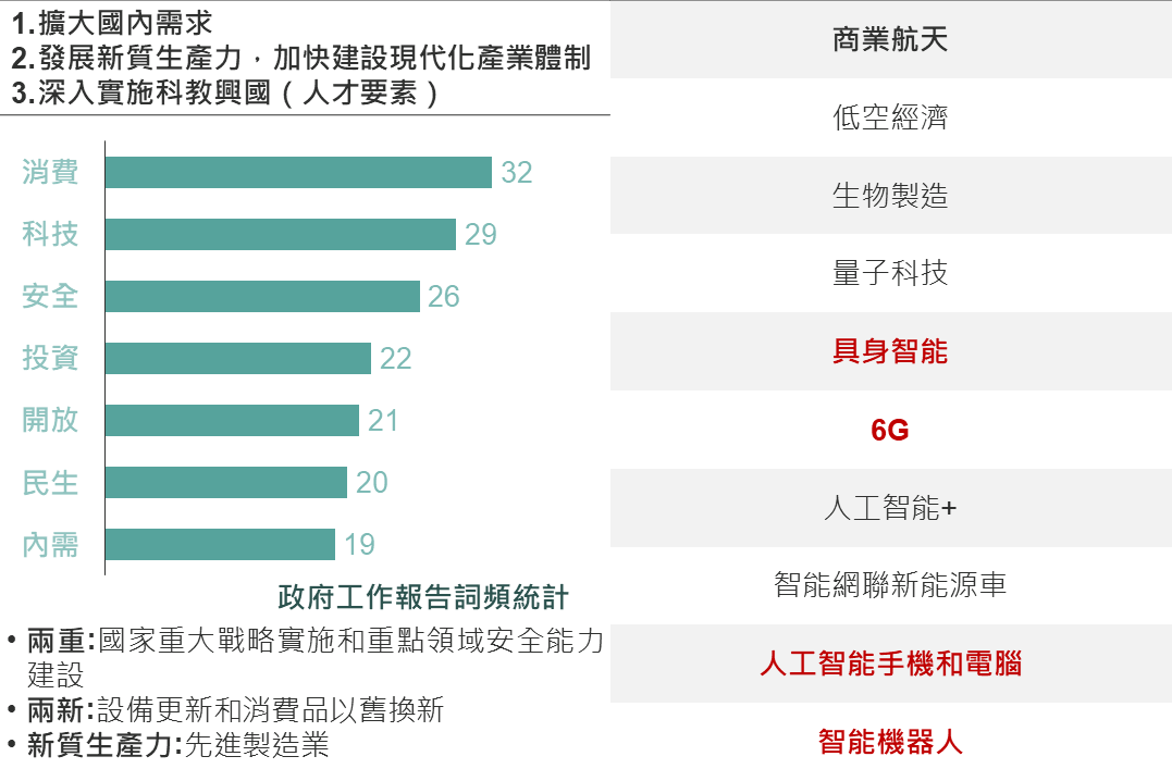 ▲ 2025年重要會議重點工作排序(左) /政府工作報告提及領域(右)