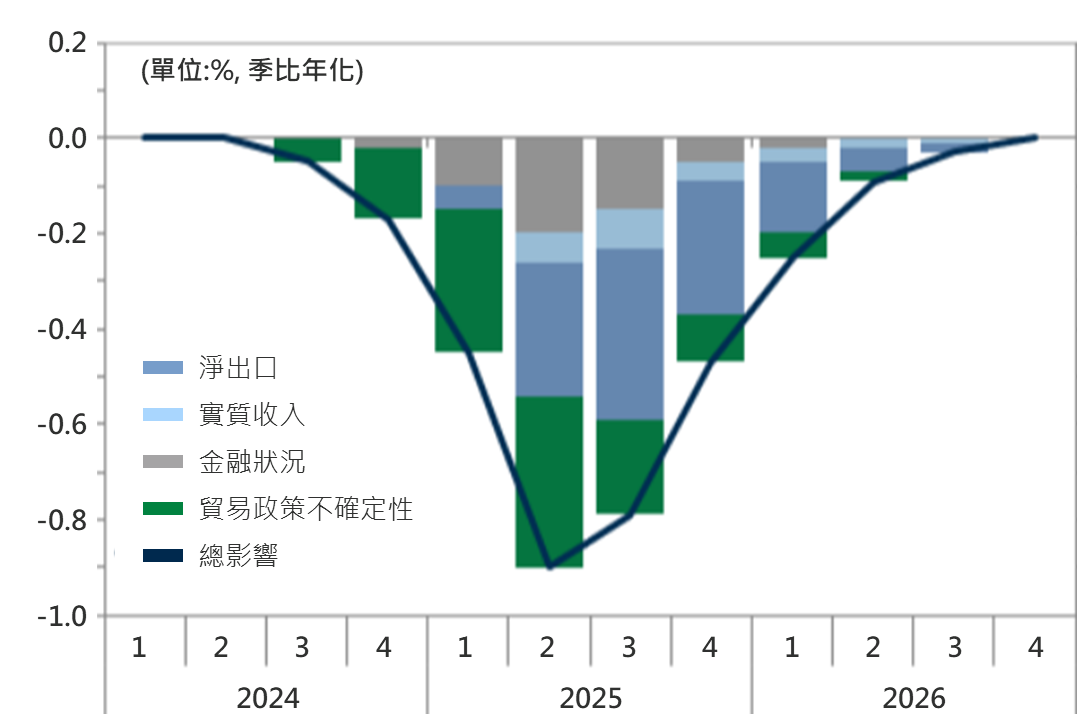 美中關稅戰持續深化,美國分別於2/4、3/4對所有來自中國商品加徵10%,目前總加徵幅度為20%,導致有效關稅亦由12%升至32%, 儘管目前美國已非中國出口重心 (美國僅佔中國出口約10-15%),然據高盛預估,加徵的關稅仍將造成中國2025年GDP0.7%的衝擊。