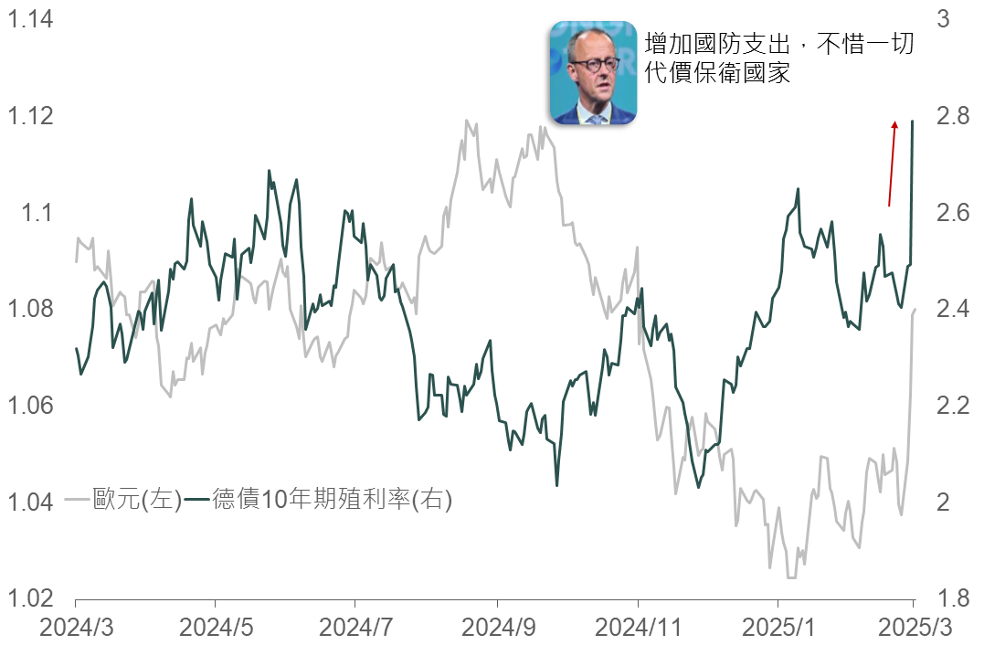 德國國會大選後,德國兩大政黨:基民/基社盟與社會民主黨於3/4達成共識,向國會提交重大財政改革計畫,內容主要為:(1)增加5,000億歐元特別基金(相當於GDP 11.6%)用於未來10年基礎建設投資;(2)修憲將國防支出排除在支出限制外。過去幾年即使因經濟陷入低迷德國政府仍嚴格遵守財政限制(債務剎車規則),不過2/23德國大選後,此一改革意味著自2008金融海嘯以來保守的財政支出態度發生重大轉變。