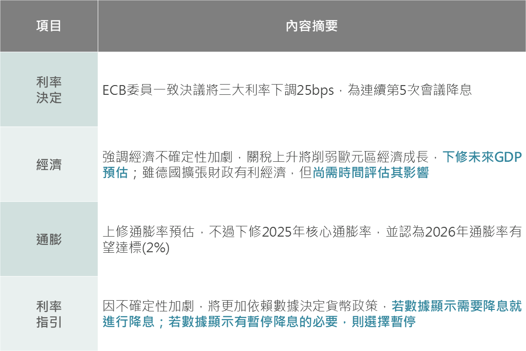 ECB 3月會議如期降息1碼,將存款利率降至2.5%,雖釋放偏鷹派之貨幣立場,提及企業和家庭借貸成本已降低,利率對經濟的「限制性正明顯減少」,暗示未來再快速降息的必要性降低,不過強調當前經濟不確定性加劇,若貿易戰升級將削弱經濟,後續將更加依賴數據判斷是否降息;並下修2025年核心通膨率預估,且預期2026年有望實現2%通膨目標,整體而言,雖ECB降息逐漸近尾聲,但在近期薪資成長率快速下滑、且通膨有望朝目標發展下料後續仍具降息空間(彭博分析師預估尚有2碼降息),料低利率有望支持歐洲經濟發展。