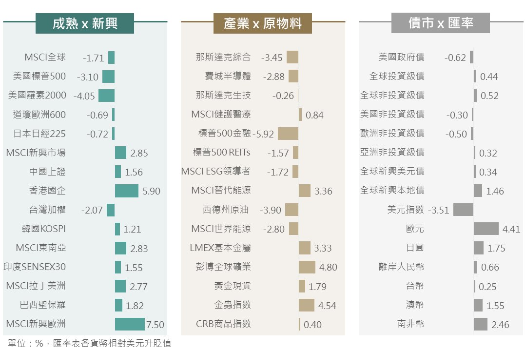 上週在川普關稅、美國經濟放緩,及科技股成長動能走緩的負面因素影響下,科技股持續引領美股及相關市場收低,而OPEC+宣布4月即將增產也壓抑了國際油價走勢;另一方面,中國兩會釋出支持經濟訊號強化陸港股表現,歐洲放寬財政限制、日銀副總裁表示有望繼續升息則添增美元指數壓力,並挹注了新興資產及金礦類股一些動能。