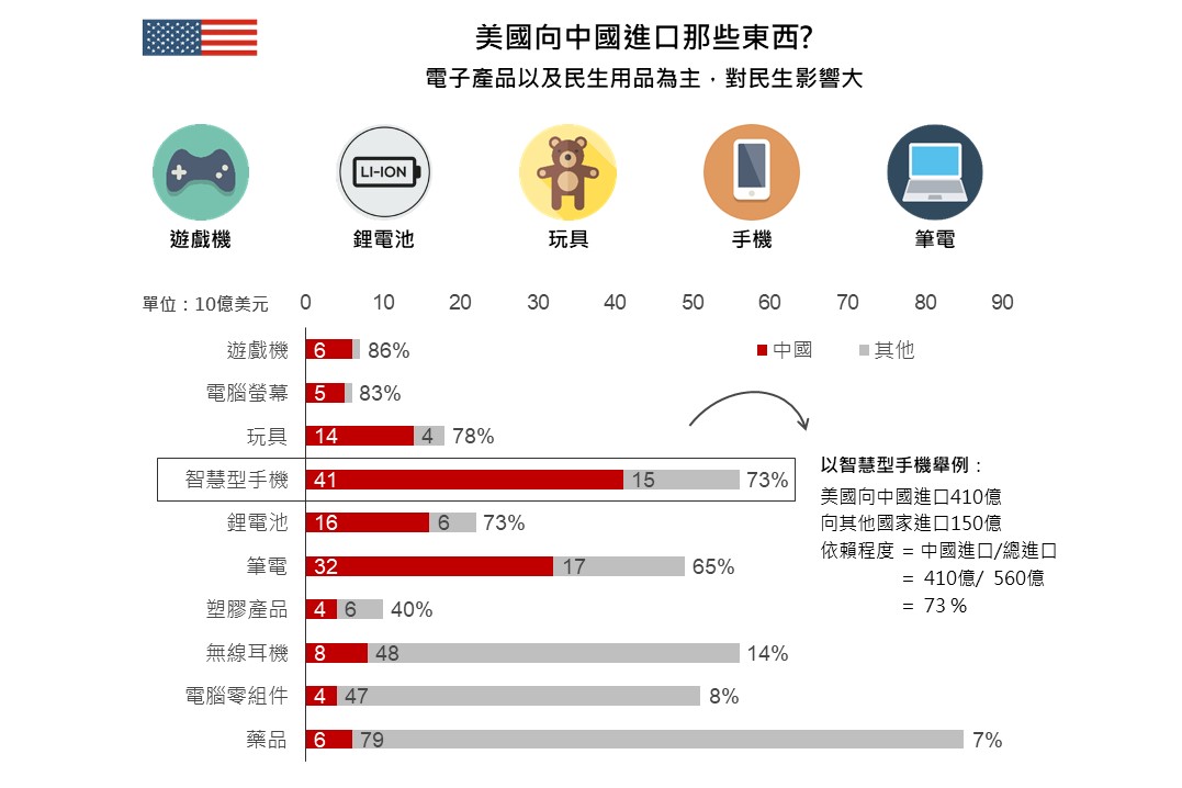 以美國向中國進口的主要產品來看,消費性電子產品如慧型手機、遊戲機、鋰電池等,來自中國比例約占7至8成,評估課徵高額關稅或使美國國內面臨較高衝擊。