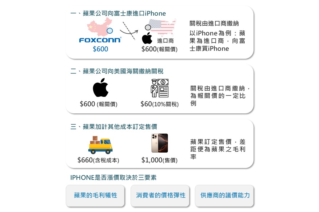 預估蘋果受影響之基本情境,短期內蘋果會承擔大部分的額外關稅並小幅調價,供應商則承擔一小部分的額外關稅;然長期而言,下游供應鏈選擇不繼續犧牲毛利,最終將調漲價格。若蘋果最終仍沒有獲得豁免,則可能將供應商的漲價,以及毛利減少的部分全部轉嫁給消費者,並由全球的消費者皆須共同承擔此費用。因此蘋果漲價在所難免,而漲價幅度取決於蘋果以及供應商願意犧牲毛利的程度,以及消費者的價格彈性而定。