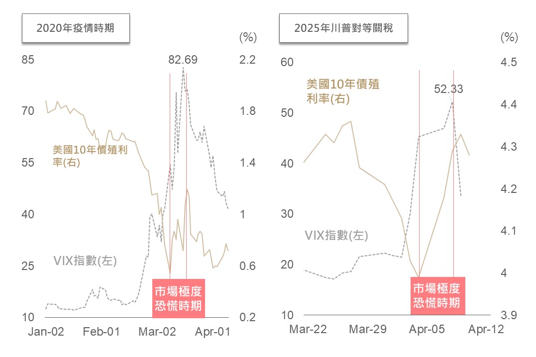 此波川普課徵對等關稅一度引發美國金融狀況指數降至疫情來低位-1.58及市場恐慌情緒升至52.33,促使市場如同2020年時激進拋售債券轉往現金避險;展望後續,關稅戰仍為市場待解議題,但基本情境預估未來關稅戰將不若先前激進,債券避險功能將回復,惟關稅戰反覆以及通膨潛在風險仍使美10年債殖利率波動加劇或延續,故建議債券天期配置上,仍以中短天期債為主。
