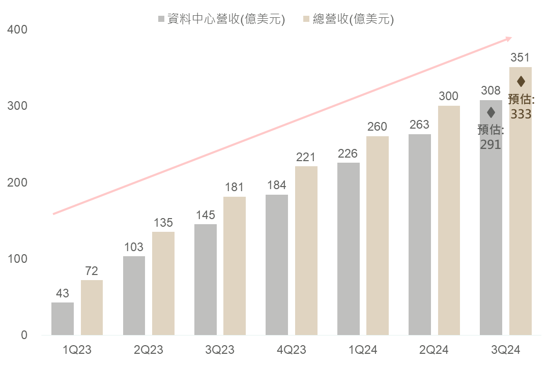 • 總營收/資料中心營收: 351/308億美元 (彭博預估: 333/291億美元)