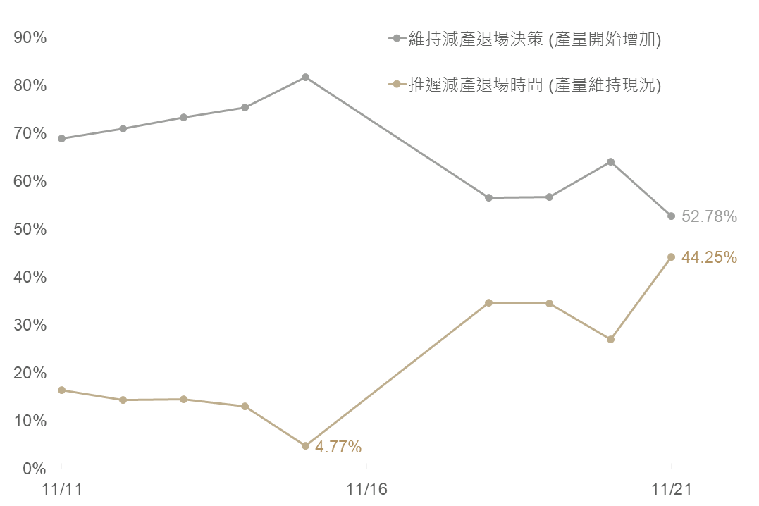 而對於後續金融市場,在黃金部分由於衝突升溫、川普政策的不確定性預期所推動之避險情緒,料刺激黃金需求,疊加尚處降息循環背景下,仍正向看待金價長期表現。原油則考量烏俄緊張局勢增溫,疊加市場對OPEC+推遲增產的機率較上週有所上升(4.8%→44.2%)下,料供應預期削減有望使油價朝區間上緣(72.5-80)邁進;惟需求端而言,三大機構持續下修明年全球油需,市場對原油供需仍以供過於求為主基調,故暫維持油價中立想法。