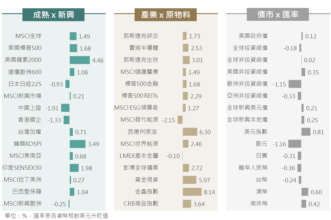 上週AI龍頭輝達Q3財報優於預期,說明AI相關需求依舊強勁,因此在市場消化整理後,科技股即引領美股為主之全球股市上行走勢;其中,俄烏戰爭升級擔憂抑制歐股漲勢,而儘管中國10月經濟數據延續回升並發布「市值管理14條」推動改革,惟市場仍觀望美中局勢發展,促使歐洲、陸港股表現遜於美股。另一方面,美國大選後川普交易暫歇、普丁批准新核彈規則提升市場避險情緒,及Fed官員謹慎降息的言論綜合影響下,多數債市指數呈現小幅震盪,僅歐洲非投資級債指數受累俄烏戰爭升級及經濟數據遜色而下跌超逾1%。