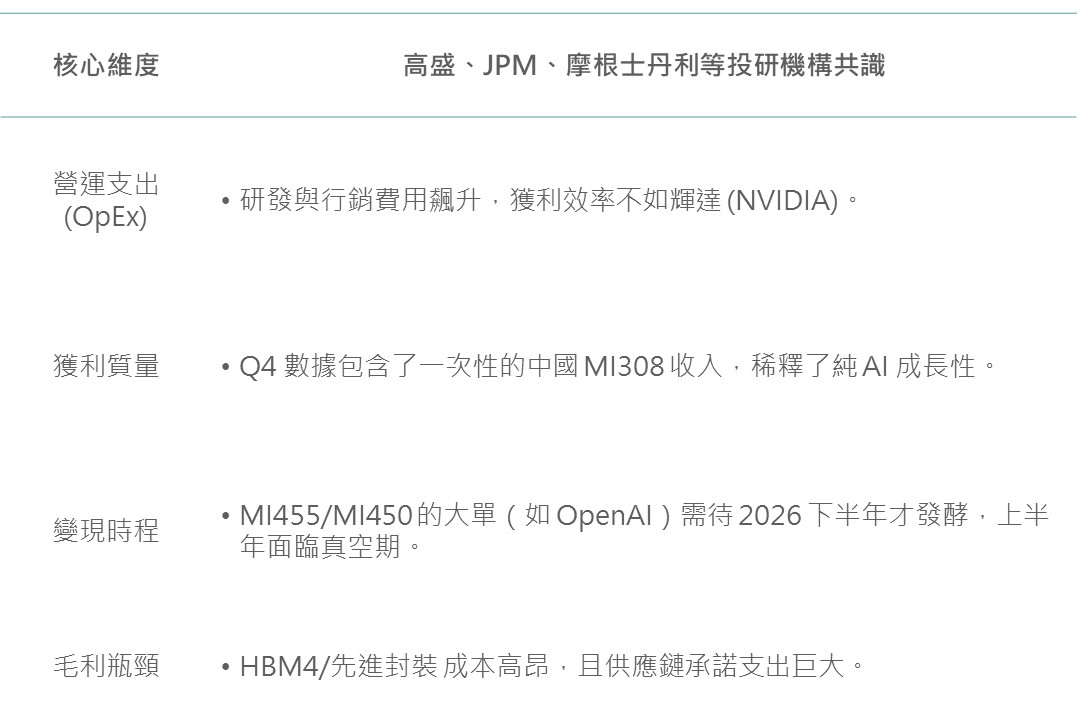 AMD財報獲利質量受質疑:儘管數據達標,但受到供應鏈干擾,其下季展望較為保守,市場擔心其在與輝達的軍備競賽中,研發與供應鏈成本(如HBM成本)正嚴重侵蝕獲利。
