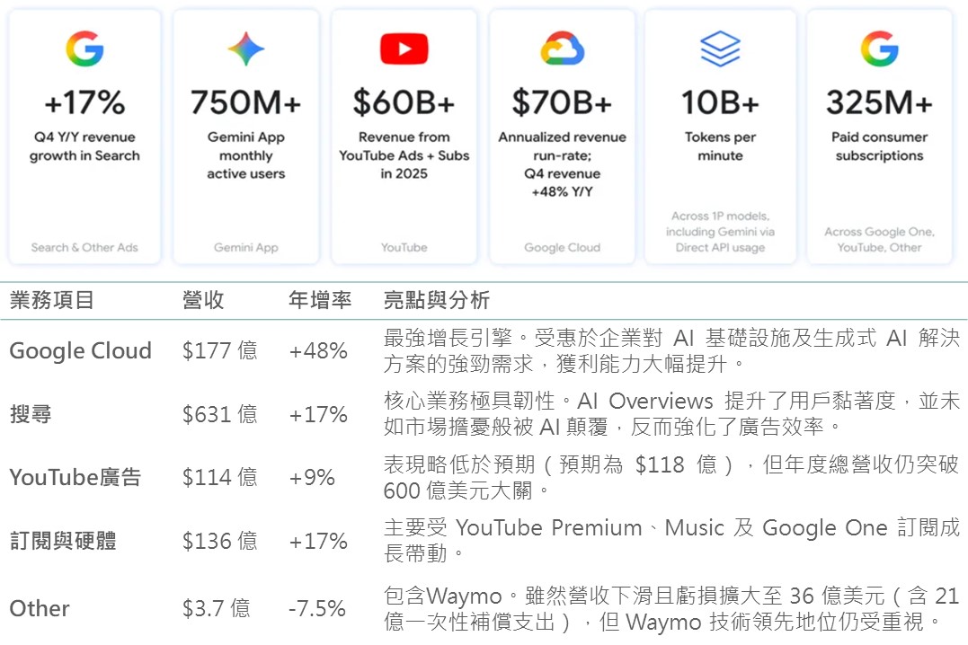 成本與效率:儘管大舉投資AI,Alphabet的營業利潤率仍維持在31.6%。公司持續透過組織優化和AI輔助開發(如AI協助撰寫程式碼)來抵銷高額投資的壓力。