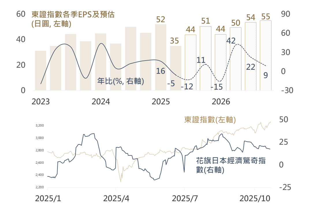 ▲東證指數預估EPS及花旗日本經濟驚奇指數