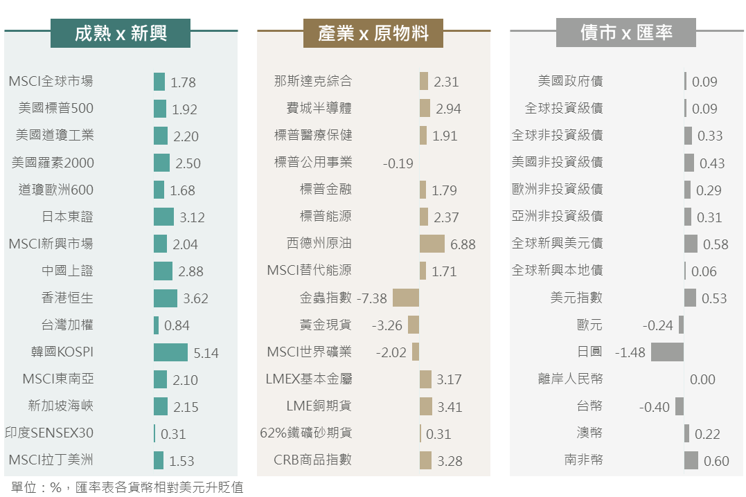 上週儘管部分美股財報不如預期,以及美國總統川普考慮限制含有美國軟體的出口品項等消息一度造成市場波動,但週初美國財長表示本週將與中國代表會面、週五公布的美國9月CPI數據持穩鞏固Fed降息預期,加上科技股持續受惠於AI利多,促使美股引領全球相關股市指數普遍上漲。商品市場方面,美國宣布制裁兩家俄羅斯石油公司,推動了國際油價走高;然而,避險情緒回落及獲利了結賣壓,則壓抑了國際金價及黃金類股的走勢。債市則受惠於良好的美債標售狀況、Fed降息期待,及風險偏好回升,提振了多數債券指數的表現。