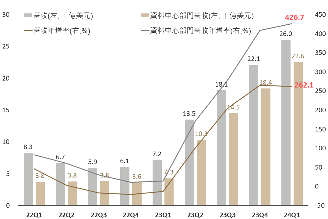 強勁之AI需求持續,使輝達盤後公布之財報再度優於預期,總營收及資料中心營收分別為260億美元/225億美元,紛紛擊敗市場預期,並分別年增262%/427%,毛利率78.9%亦顯著高於預期。此外,下一季度財測為280億美元正負2%,優於預期之268億美元。