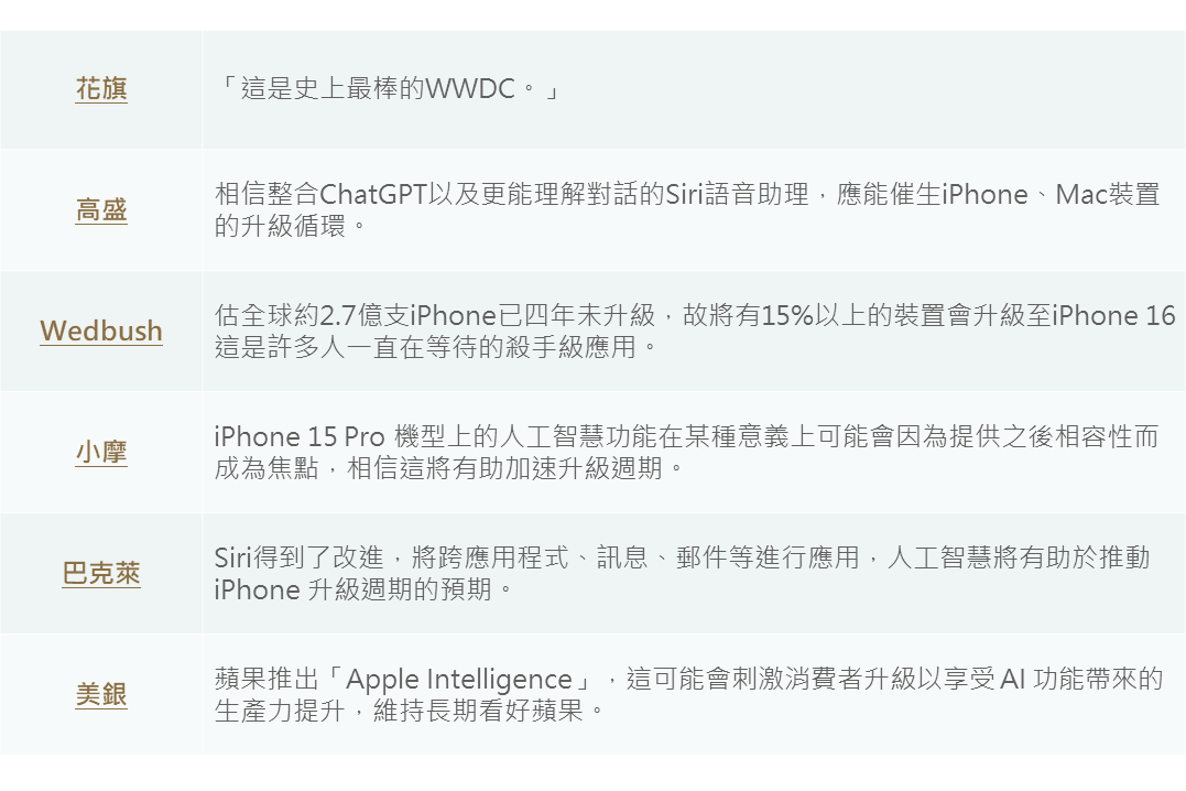 然另一方面,蘋果於週一舉辦WWDC全球開發者大會並公布最新的AI策略;雖其AI應用於WWDC結束當日並未能引起市場共鳴,然次日後,華爾街一眾分析師卻陸續發表正向反饋,認為此將有助加速iPhone、Mac等裝置之換機週期。昨日蘋果股價強升、市值反超輝達,並助昨日標普500指數及那斯達克指數再創高。