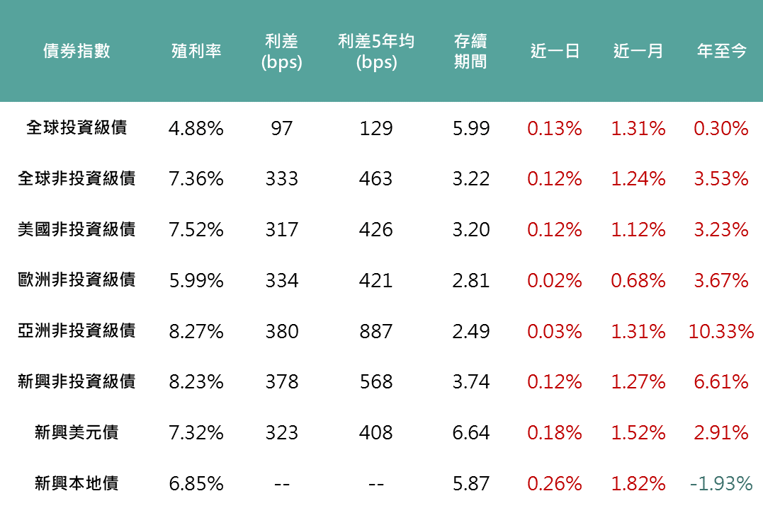 全球投資級債上漲0.13%、美非投上漲0.12%、新興美元債上漲0.18%;受惠智利關鍵電池零件獲得美國稅收抵免資格,以及哥倫比亞宣布縮減支出以防止財政惡化,推動拉美債匯上揚,促本地債上漲0.26%。