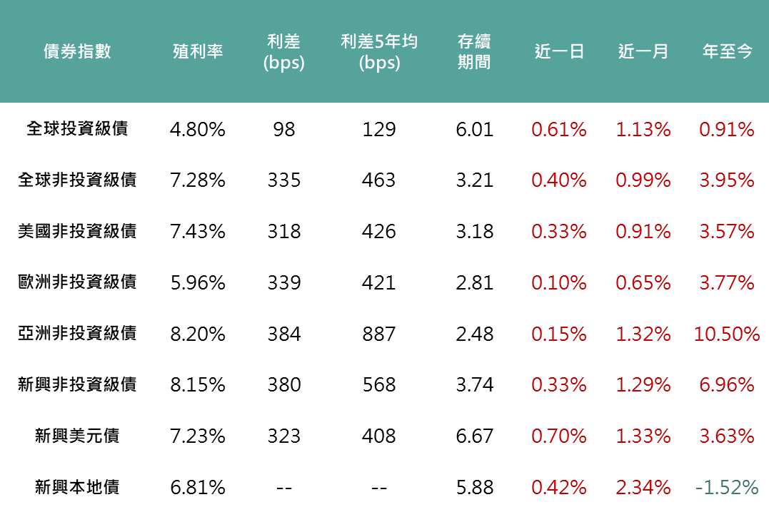 受惠昨日美國6月CPI年增3%,低於前值3.3%與市場預期3.1%,且月增率首度轉負,美國通膨數據趨緩,提振市場對Fed年內降息預期,FedWatch顯示9月降息1碼機率由前日69%大幅增加至84%,壓抑以短天期為首美債殖利率,整體美債殖利率曲線趨陡,而各債種報酬普遍走揚,全球投資級債上漲0.61%、美非投上漲0.33%、新興美元及本地債分別上漲0.7%、0.42%。