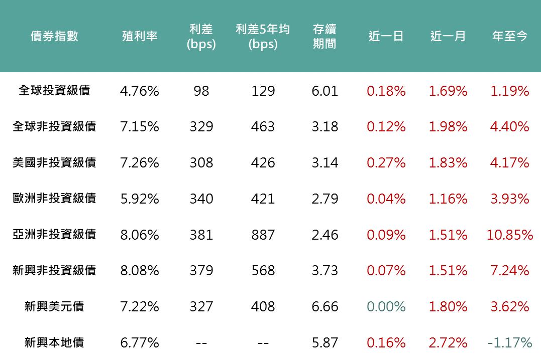 拉美美元債利差走擴,使新興美元債表現持平。