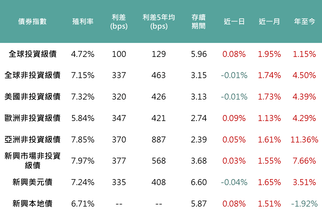 美國6月JOLTs職缺數818.4萬,高於市場預期800萬,此外,消費者信心指數攀升至100.3,顯示美國消費者信心轉為樂觀,使美債殖利率上揚,然而盤中發生以色列空襲黎巴嫩首都事件,中東衝突升溫促市場避險情續增加,促美債殖利率轉為下跌,亦使各債種漲跌互見,全球投等債上漲0.08%、全球非投等債與新興美元債分別下跌0.01%與0.04%,新興本地債則是上漲0.08%。