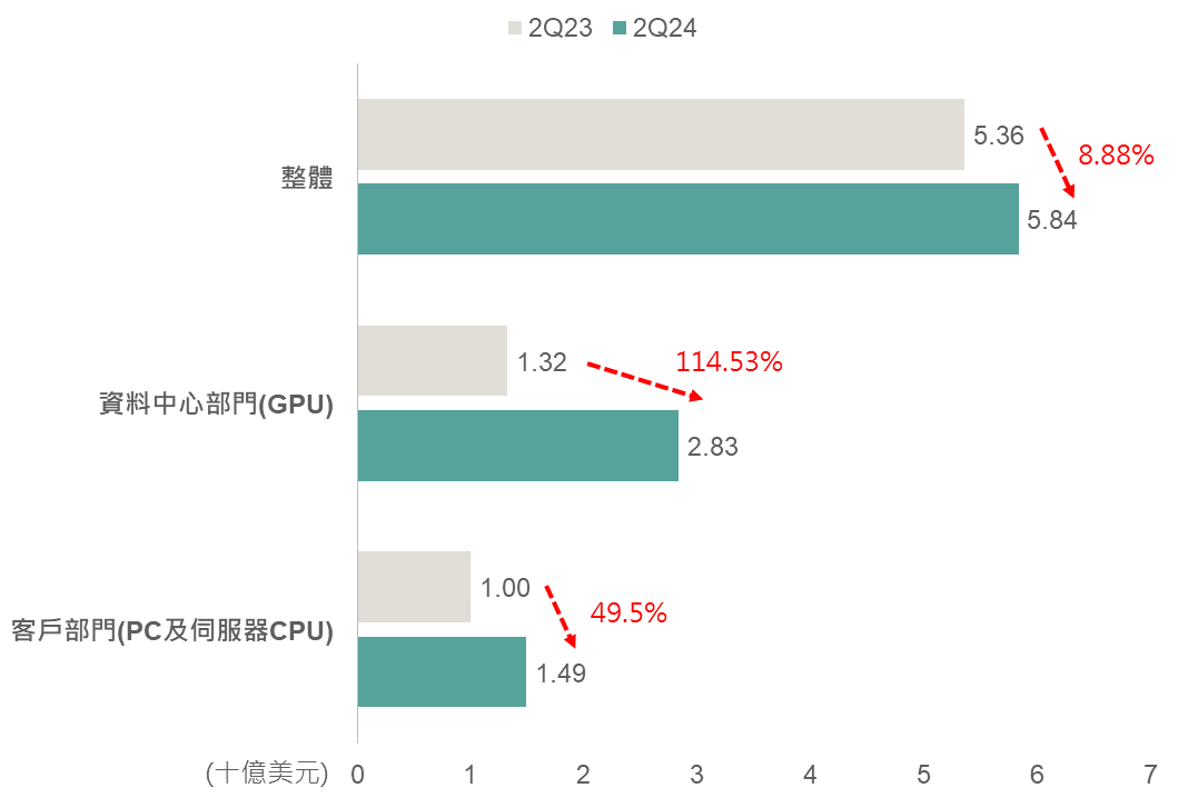 AMD於昨日盤後公布Q2財報,營收/EPS分別年增9%/19%至58.35億美元/0.69美元,優於預期之57.2億美元/0.68美元,其中資料中心部門表現亮眼,營收年增115%至28億美元,另外客戶部門(筆電及伺服器CPU業務)CPU銷售強勁成長,較去年同期增長49%至15億美元,顯示PC市場正逐步復甦。展望方面,Q3營收區間為64-70億美元,優於市場之66.1億美元,執行長蘇姿丰表示AI晶片之銷售優於預期,且將2024全年資料中心GPU之營收自4月預估之40億美元上調至45億美元,優異財報及財測表現促其目前盤後大漲近8%。