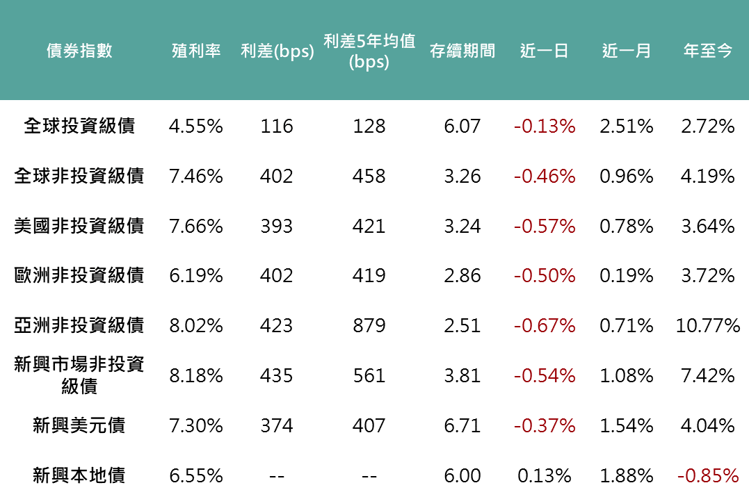 雖昨日公布美國ISM非製造業指數51.4重返榮枯線之上,小幅緩解市場對美國經濟衰退擔憂,使昨日美債殖利率低開後收斂跌幅,然整體市場對美國經濟衰退擔憂仍未完全消退下,10年期公債殖利率仍小幅回落至3.78%,2年期公債殖利率回升至3.92%,而各債種隨市場對美國經濟衰退擔憂影響下,債券利差持續擴大,尤以非投等債擴大明顯,使各債券報酬多數回落。