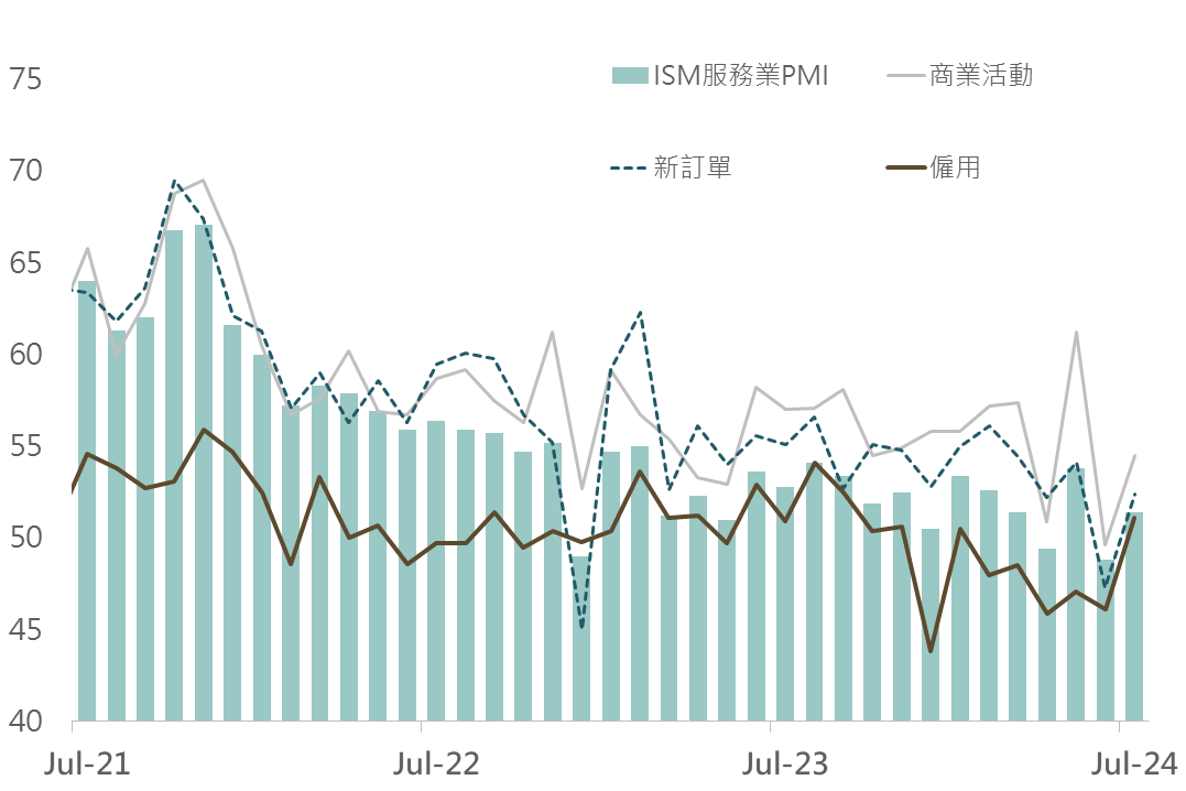 昨日美國公布7月ISM服務業PMI自48.8升至51.4(預期51.0),高於榮枯線(50.0)並由收縮轉為擴張;其中,細項商業活動指數自49.6升至54.5,新訂單指數自47.3升至52.4,就業指數亦自46.1升至51.1(預期46.4)。