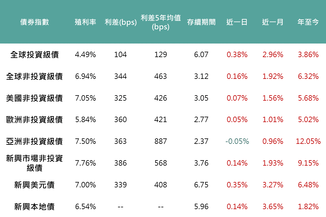 市場預估美國勞動部將下修今年3月的過去一年內非農新增就業人數,下修人數預估約60萬至100萬人,顯示美國就業市場恐未如原先預期強勁,促使市場增加Fed降息預期,並推動各天期美債殖利率下跌,主要債種受惠殖利率回落而上漲,全球投等債上漲0.38%、全球非投等債上漲0.16%、新興美元債上漲0.35%。