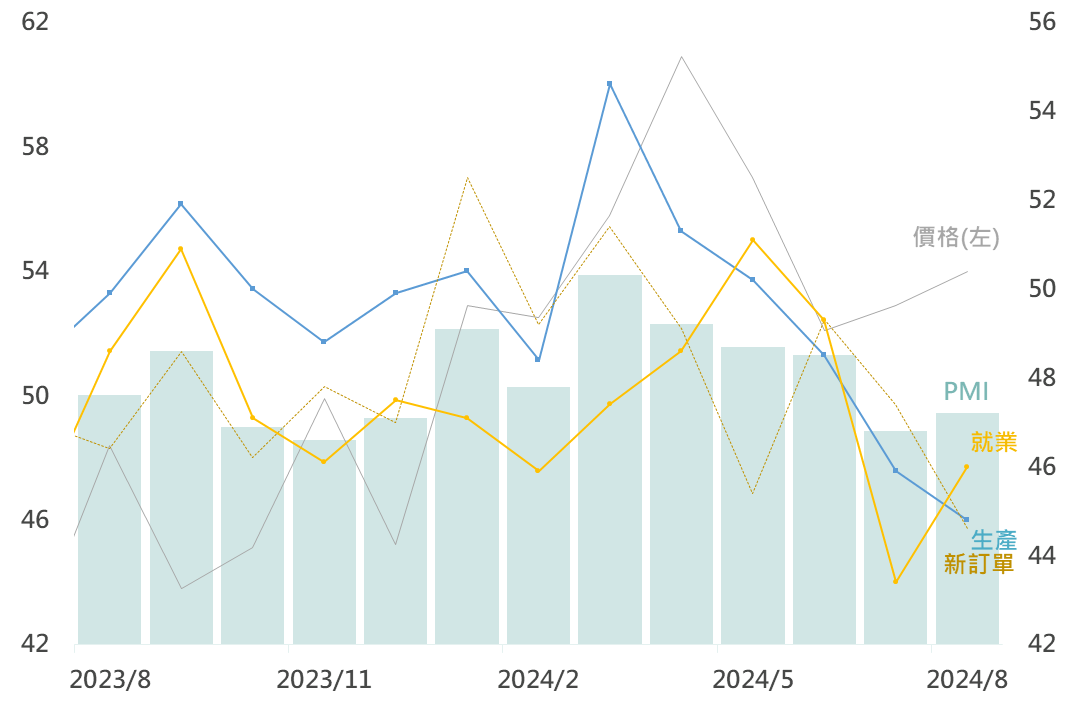 然觀察細項中之就業指數(46.0)於8月明顯反彈,顯示雖美國就業狀況亦呈現放緩,然其並未如先前市場預期般持續惡化,評估在就業狀況仍屬穩定之情況下,將支撐美國經濟保持韌性。此外,根據8月ISM製造業PMI報告調查,企業持續提到Fed料於9月降低利率水準,且在11月美國總統大選前之政治不確定性仍存,皆導致廠商暫緩投資或保守管理庫存。綜上評估,預期隨後市Fed啟動降息,將有助支持美國經濟朝向軟著陸;而隨年底美國總統大選之結果明朗,不確定性降低亦有助提振投資氛圍,預期美股於大選前仍將延續震盪格局,惟仍正面看待景氣於年底具回升改善之空間