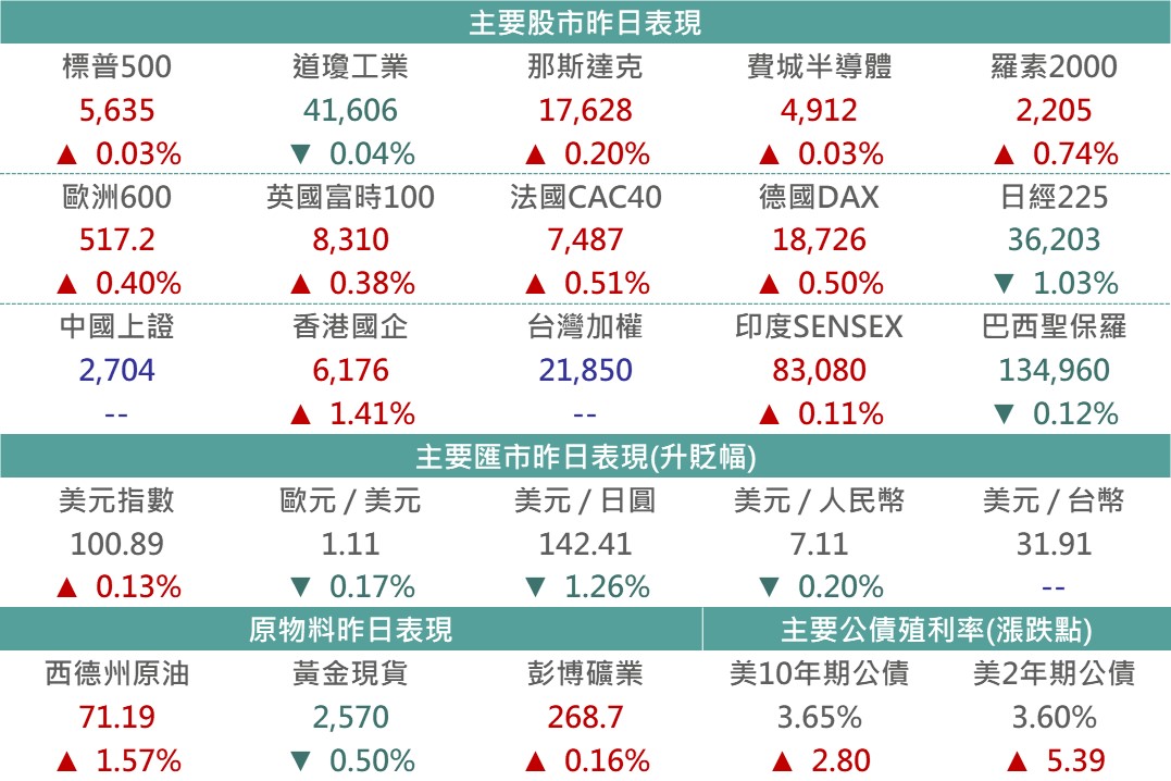 美股方面,零售銷售數據優於預期提振市場對於經濟軟著陸之信心,亦助美股早盤走揚,標普500指數盤中觸及歷史新高,惟市場觀望即將召開的9月Fed利率會議結果,市場高度預期本次會議將迎來首次的降息,且本次會議亦將公布Fed利率點陣圖及經濟預估展望;在觀望氛圍下,昨日美股尾盤漲勢收斂而後略收於平盤。
