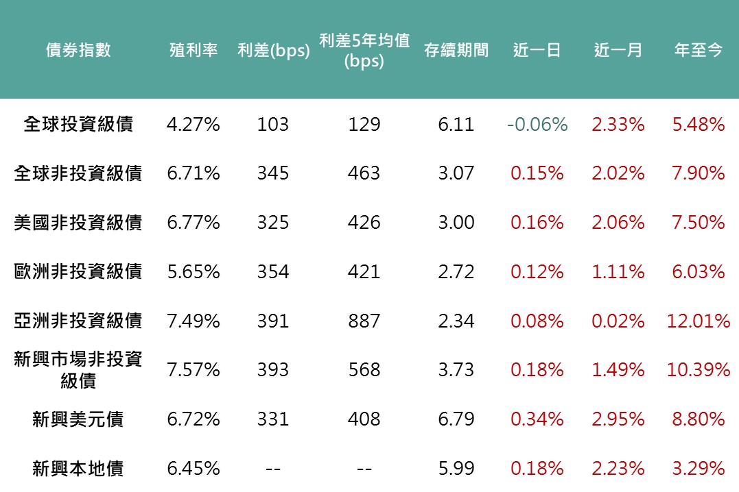 昨日受美國財政部標售130億20年期公債,顯示中標利率較前次增加2bps,且反映海外需求之間接交易商獲配比率僅65.1%,較上月71%明顯下滑,公債拍賣需求疲弱疊加市場觀望週四Fed利率會議結果,推升各天期美債殖利率,美國十年債殖利率升至3.65%;而各債種價格受惠美國零售銷售與紐約州製造業數據優於預期,使利差收斂帶動除投等債小幅下跌0.06%外,多數債種價格上漲,美非投上漲0.16%、新興美元及本地債分別上漲0.34%、0.18%。