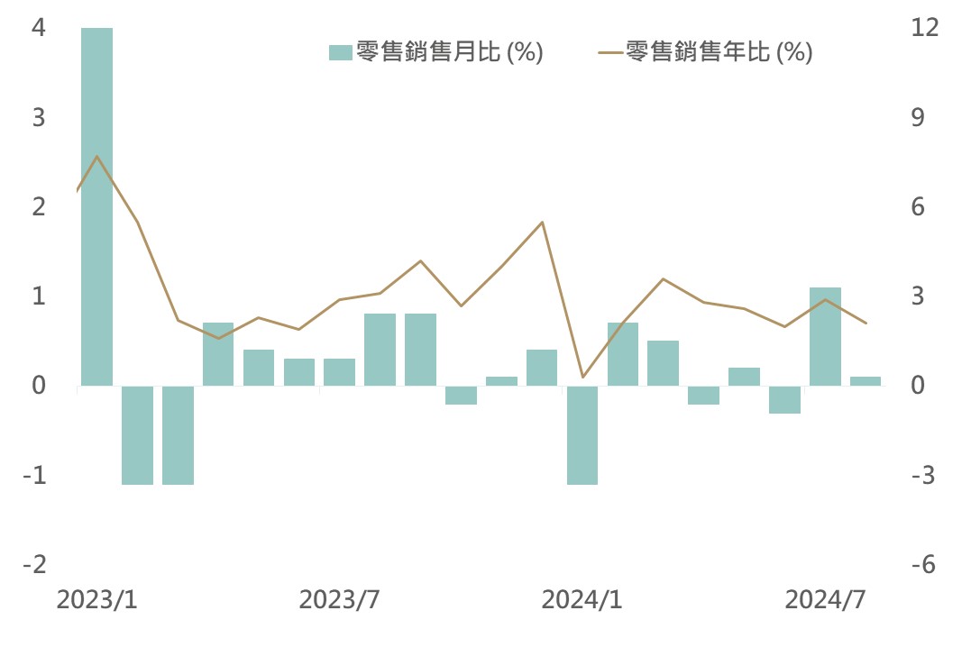 美國公布8月零售銷售數據月比為0.1%,優於市場原先預期的-0.2%,且前值自1.0%上修至1.1%;整體而言,美國零售銷售動能有所放緩,惟受惠電商銷售持續增長(月增1.4%),使整體銷售狀況表現穩健。
