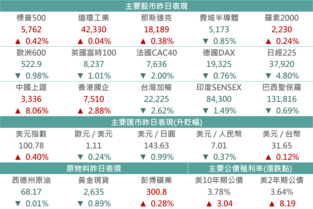 昨日鮑威爾強調,9月Fed利率會議一次降息兩碼,不應代表央行未來還會如此激進。若未來經濟數據符合預期,後續會議將以各降1碼幅度支持美國經濟軟著陸,整體符合前次利率會議基調,然市場先前過度預期年內降息幅度獲得修正,盤中一度使美股轉跌,而尾盤在主要科技股支持下,帶動美股主要指數(除費半)回升。