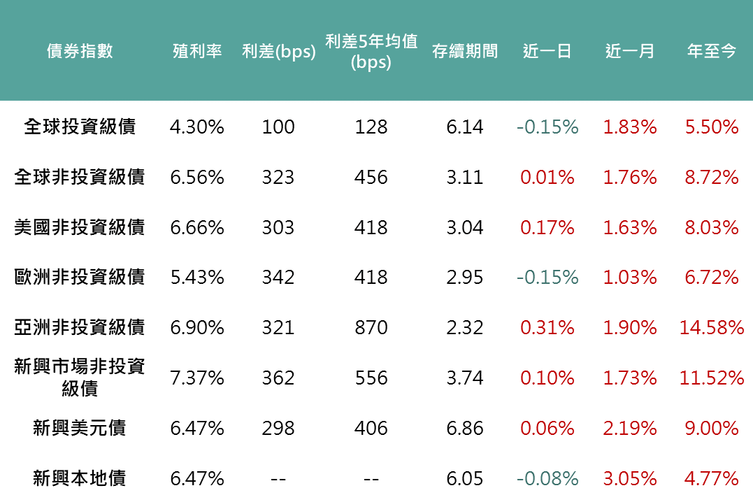 昨日Fed主席鮑威爾釋出的談話澆熄市場對下次會議降息兩碼的期待,根據FedWatch數據顯示,降息兩碼的機率從53.3%下降至35.4%,促各天期美債殖利率上揚。而各債種價格隨美國經濟有望軟著陸支持下,債券利差多數收斂,支持多數債券報酬走揚。