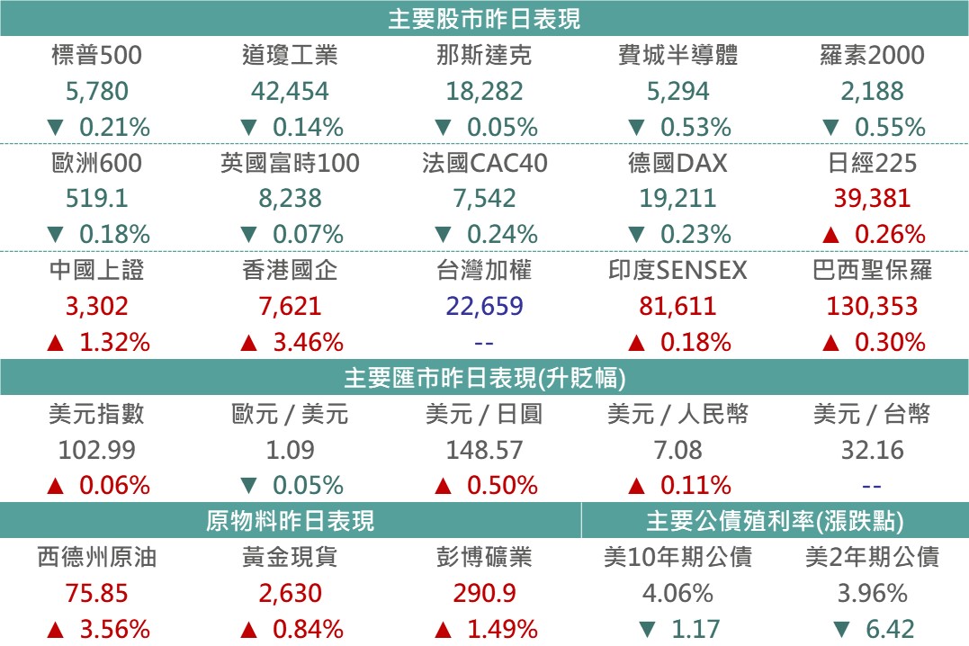 昨日盤前公布之通膨數據高於預期且就業數據呈現放緩,市場爭論下月降息前景,促近期漲多的半導體類股領跌,帶動科技股終場收黑。