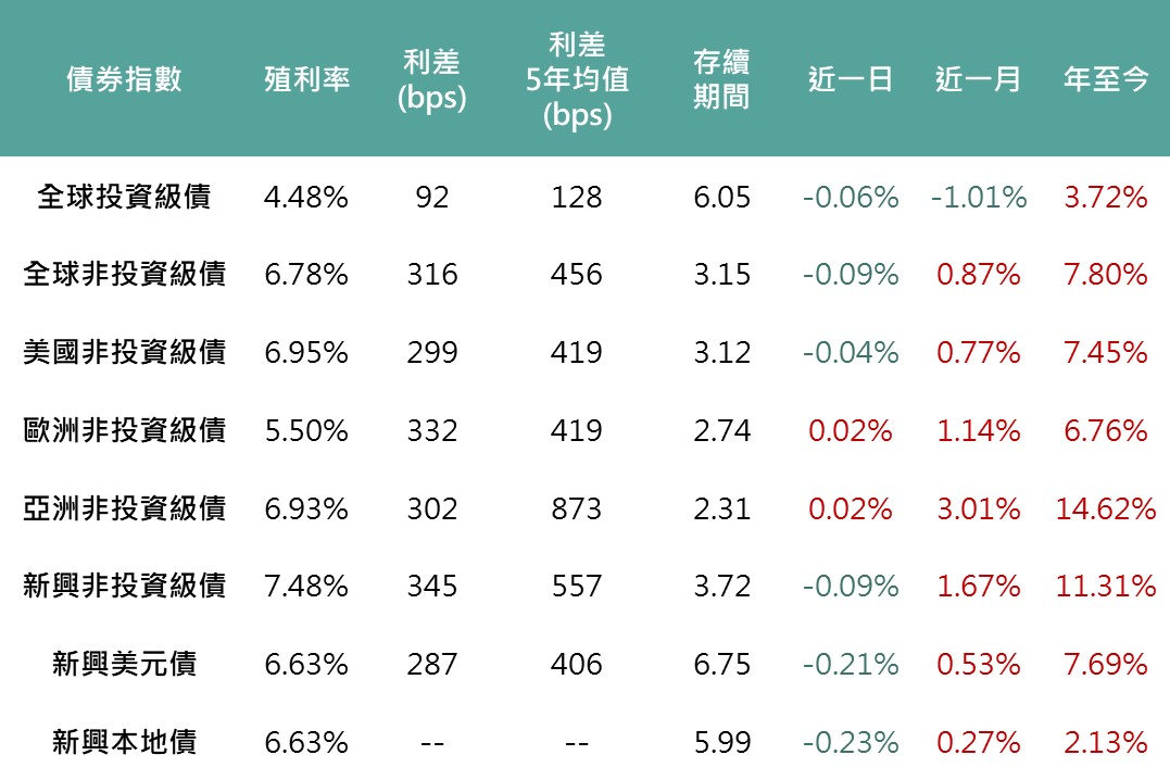 昨日財政部標售30年期公債,市場需求強勁,亦為昨日美債殖利率下行因素,美國10年期公債殖利率降至4.06%、2年期公債殖利率回落至4%以下;而各債種隨就業數據偏弱影響,債券利差擴大,使多數債種價格下跌,全球投等債下跌0.06%、非投等債下跌0.04%、新興美元及本地債分別下跌0.21%、0.23%。