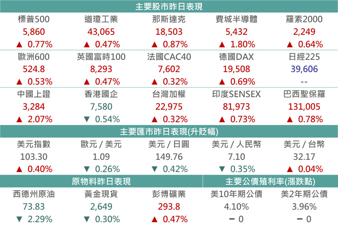 受惠AI晶片需求持續唱旺,AI龍頭輝達漲勢延續;近期輝達利多頻傳,包含(1)執行長黃仁勳接受訪問表示Blackwell晶片之需求接近「瘋狂」;(2)上週AI Summit研討會中,多數投行與輝達高層談論過後,紛紛表示Blackwell晶片未來12個月內產品已全面售罄,且看好OpenAI發布推理模型o1後,晶片需求長期需求前景將更為明朗;(3)供應鏈台積電之營收表現持續亮眼,Q3季營收續寫最高紀錄,且優於財測上緣。種種利多顯示近期市場持續看好AI晶片後市發展,並帶動本月輝達股價強漲約14%,市值3.42兆亦逼近全球市值龍頭蘋果之3.53兆美元。