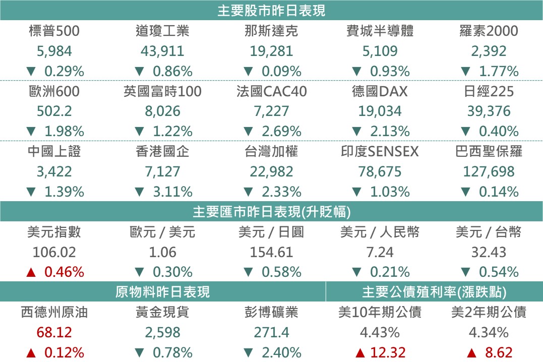 市場延續對於川普上任後引發通膨升溫的風險,以及財政赤字擴大的擔憂,使各天期美債殖利率呈現大幅攀升,促昨日各債種回落,全球投等債下跌0.66%、全球非投等債下跌0.26%、新興美元債下跌0.5%,由於市場預期川普於任內將對全球課徵關稅,使美元持續走強,新興貨幣普遍貶值,促新興本地債下跌0.56%。