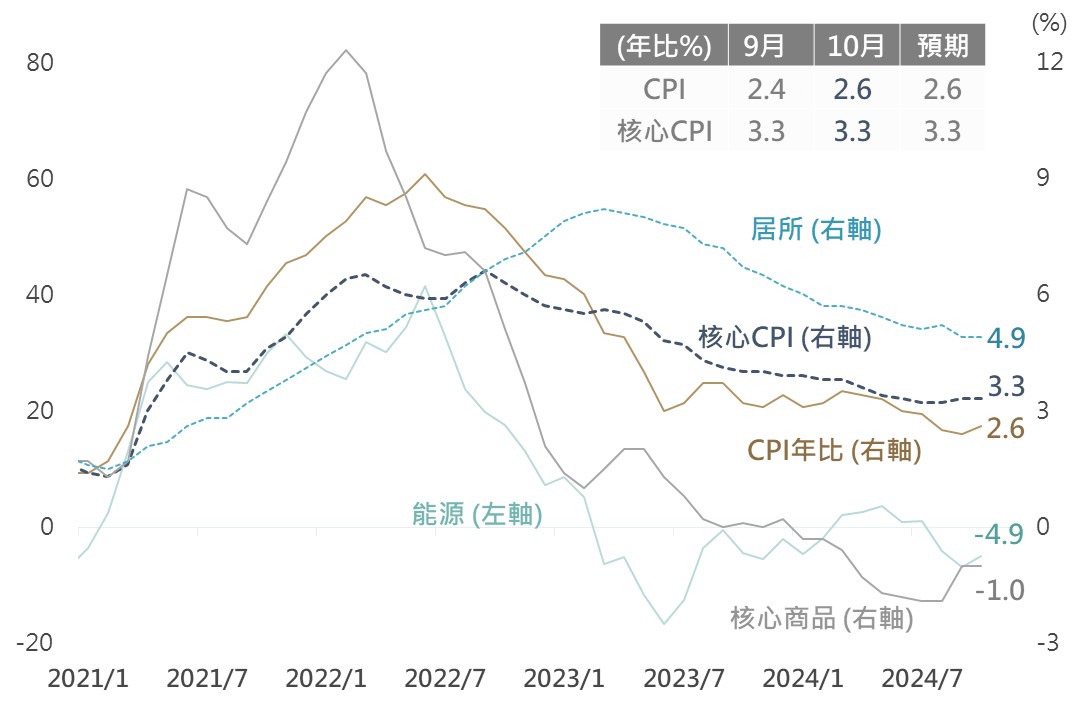 美國10月CPI數據年增自上月2.4%上升至2.6%,核心CPI年增3.3%與上月持平,兩者皆符合市場預期,其中通膨細項,住房通膨年增穩定持平於4.9%、核心商品年增-1%、能源通膨-4.9%相較上月-6.9%回升。