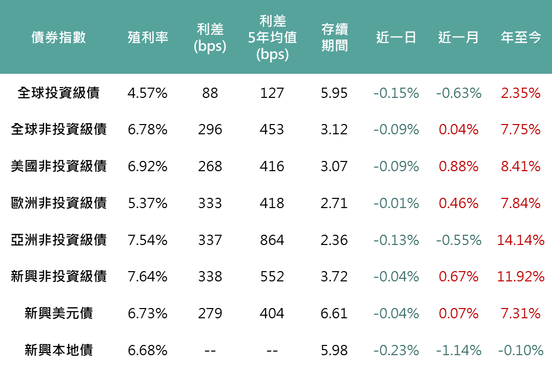 通膨升溫的疑慮,推升長天期殖利率,而川普釋出的關稅言論亦導致各債種利差普遍走擴,使昨日各債種普遍呈現下跌,全球投等債下跌0.15%、全球非投等債下跌0.09%、新興美元債下跌0.04%,新興本地債方面,由於墨西哥將面臨關稅挑戰,促墨西哥披索大幅貶值,帶動新興本地債下跌0.23%。