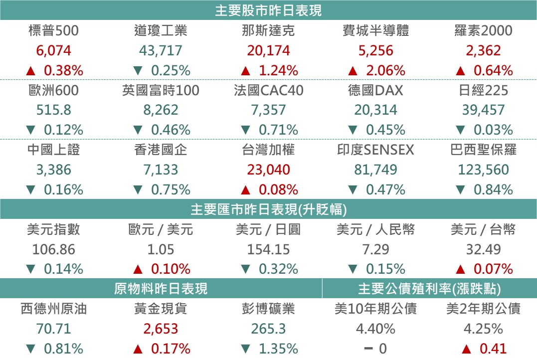 美國公布12月標普製造業PMI初值自49.7降至48.3,反映製造業復甦狀況仍不穩定,惟12月標普服務業PMI初值自56.1升至58.5,服務業擴張動能依然相當強健,為提供美國經濟韌性之重要支撐因素。市場觀望將於台灣時間本週四凌晨公布之Fed利率會議結果,而在美國經濟表現仍強健下,市場普遍預期Fed將於本次會議釋出放慢降息步伐之訊息,利率點陣圖亦存有上修可能性;昨日市場在觀望格局下,歐、亞股市普遍呈現修正,美股盤面個股亦多以收跌居多,然包含博通、特斯拉及Google等科技權值股表現強勢,支撐標普500指數收高。