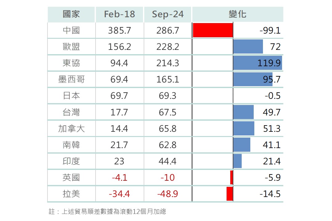 ▲ 其他國家/地區與美貿易順差變化(十億)