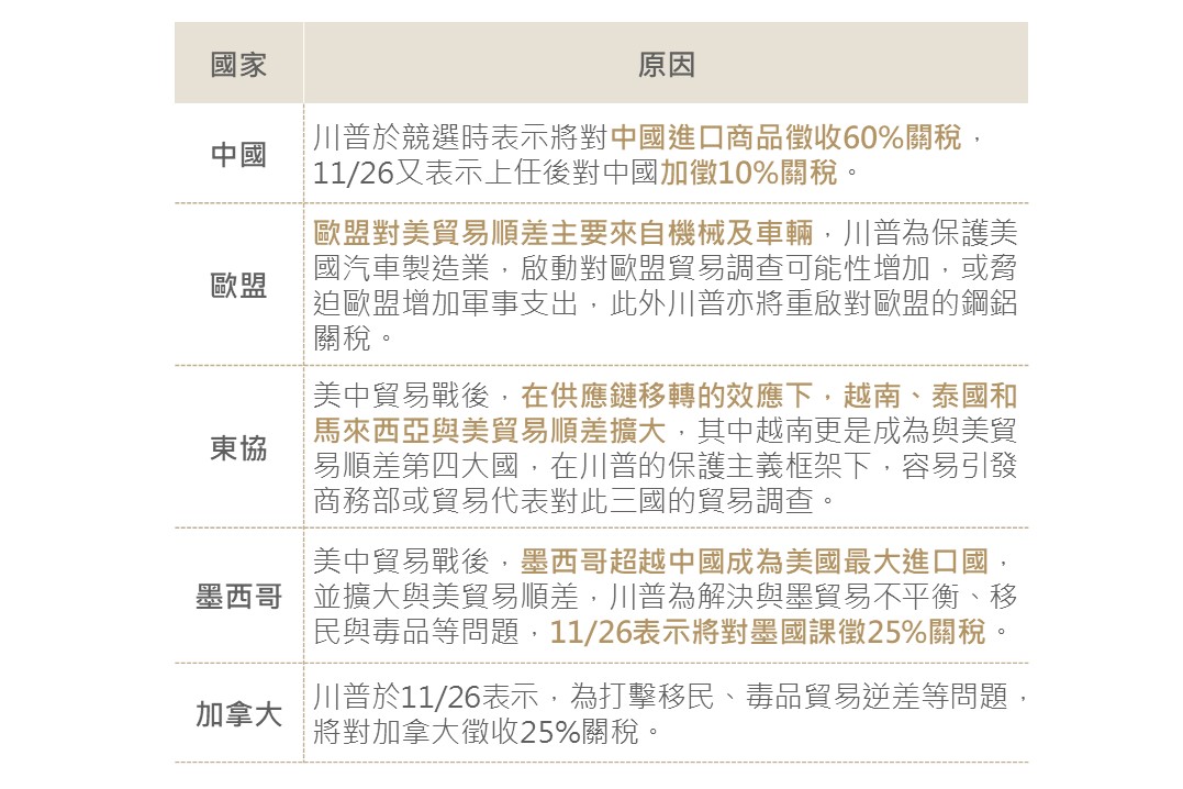 川普提出對中國課徵高達60%的關稅,並對其他國家商品徵收10%-20%關稅,以縮減貿易逆差、提高本土產業競爭力。據玉山銀行投資研究中心預測,關稅調升僅需總統職權,可能成為川普上任百日內的施政重點。